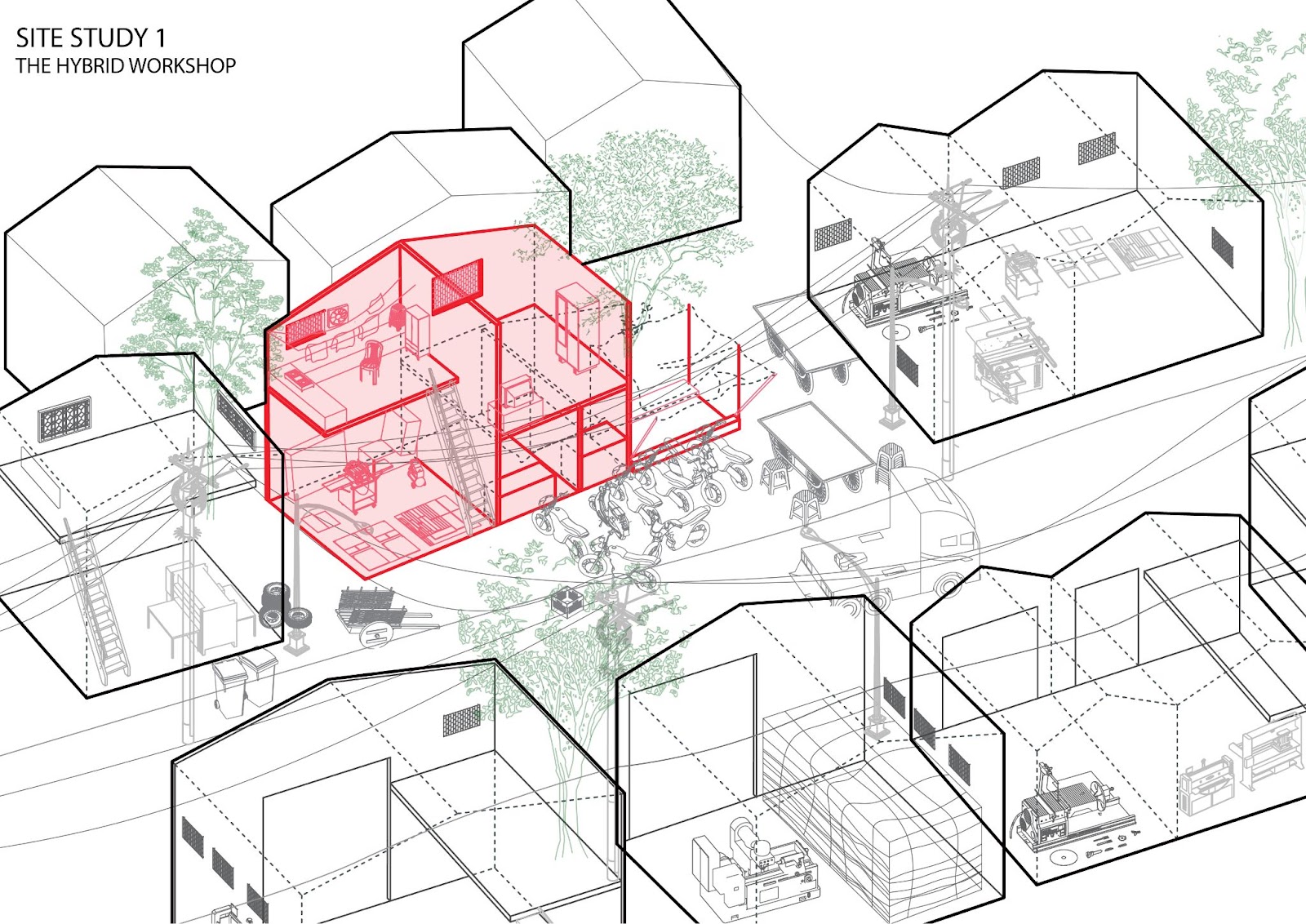 To research I identified nine contemporary housing cases that accommodate living and working conditions. These cases present a housing condition where the house as a living space was transformed and adapted to accommodate work. The forces of industrial restructuring, communal violence and even the Covid pandemic have shaped the hybrid living and work conditions in these cases. I analysed each case and its spatial transformation through visual observation and interviews that mapped how the introduction of a work space emerged out of emerging contexts of urbanization, and how it has transformed routines, spatialities and the form of life of its residents.